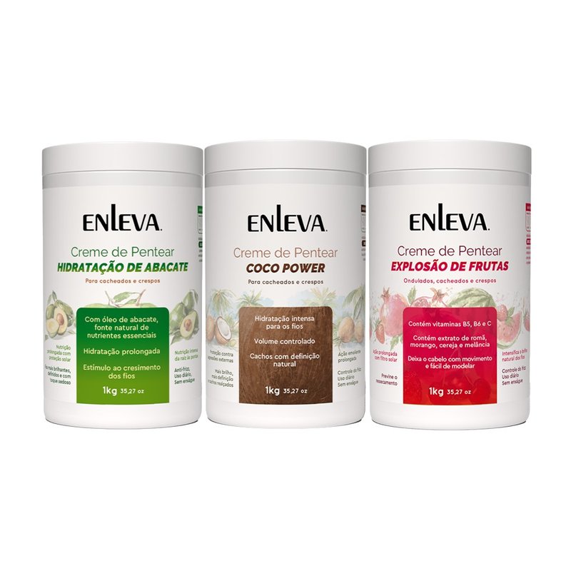O Kit Trio de Cremes de Pentear da Enleva é a combinação ideal de ingredientes naturais e vitaminas para quem ama variar a rotina capilar sem abrir mão da qualidade e do resultado. Com 3 cremes de 1Kg, seus cabelos cacheados, crespos e ondulados terão à disposição um tratamento completo que hidrata, nutre, controla o volume e estimula o crescimento.
